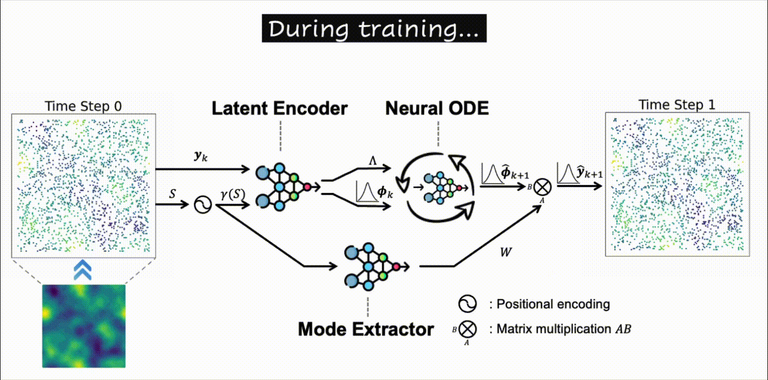 We train the model using only 10% of fixed datapoints from the ground-truth field. This structure yields an interpretable, uncertainty-aware