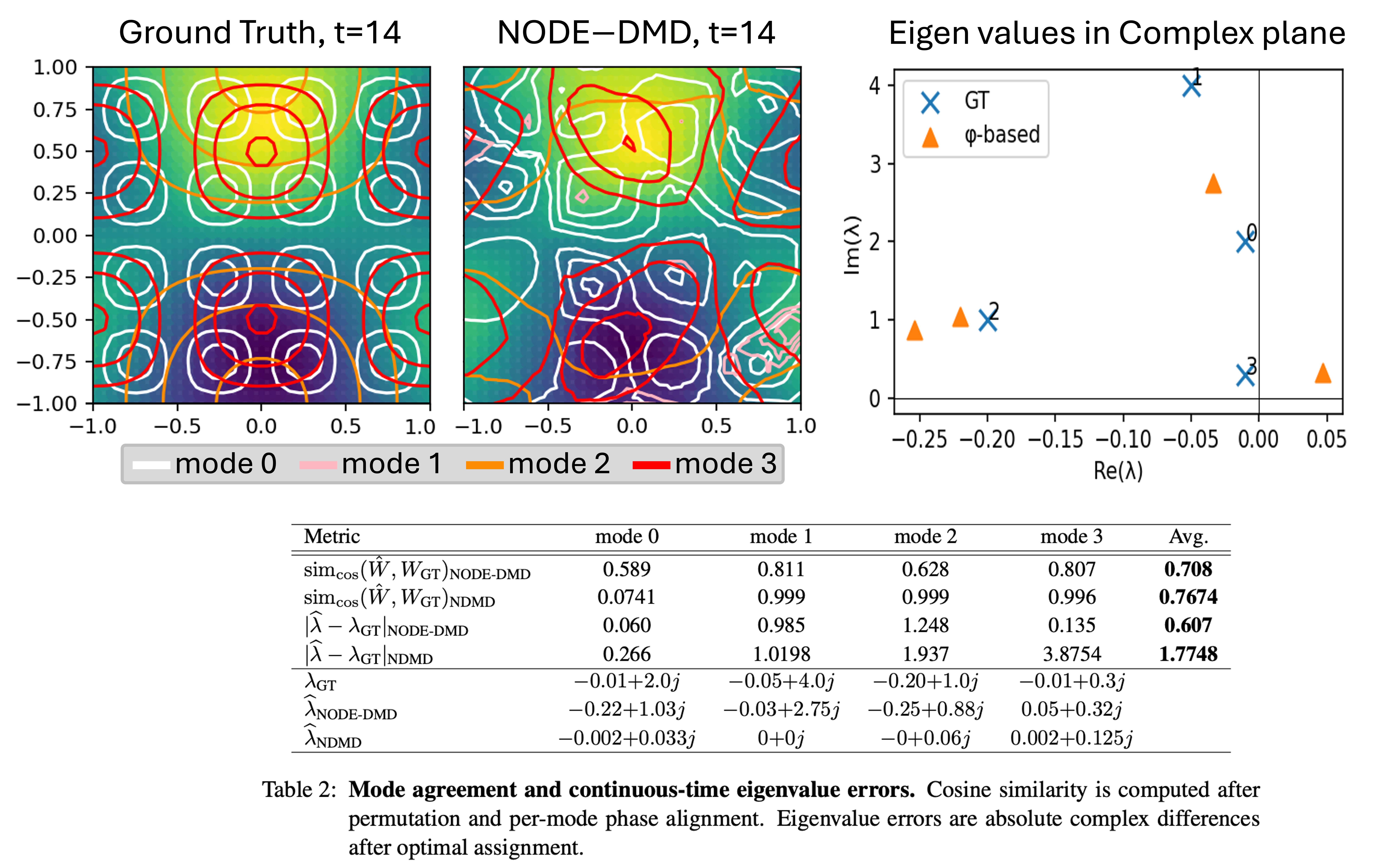 1) Recovery of true dynamics using a synthetic benchmark where ground-truth modes and eigenvalues are known, allowing direct comparison with the learned structure.