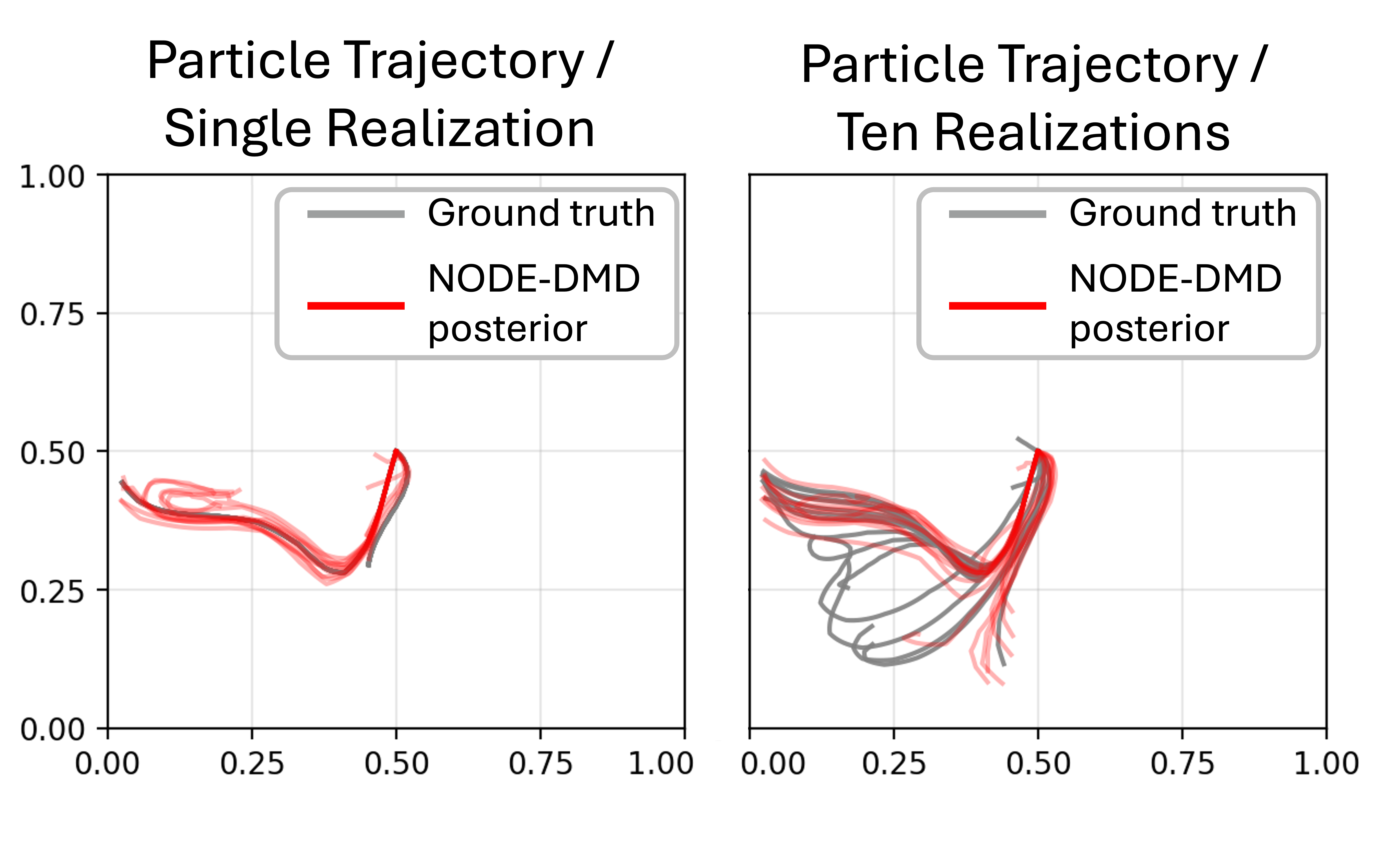 2) Stochastic dynamics modeling by training on multiple realizations of the same system and verifying that the model captures ensemble variability rather than collapsing to an averaged trajectory.