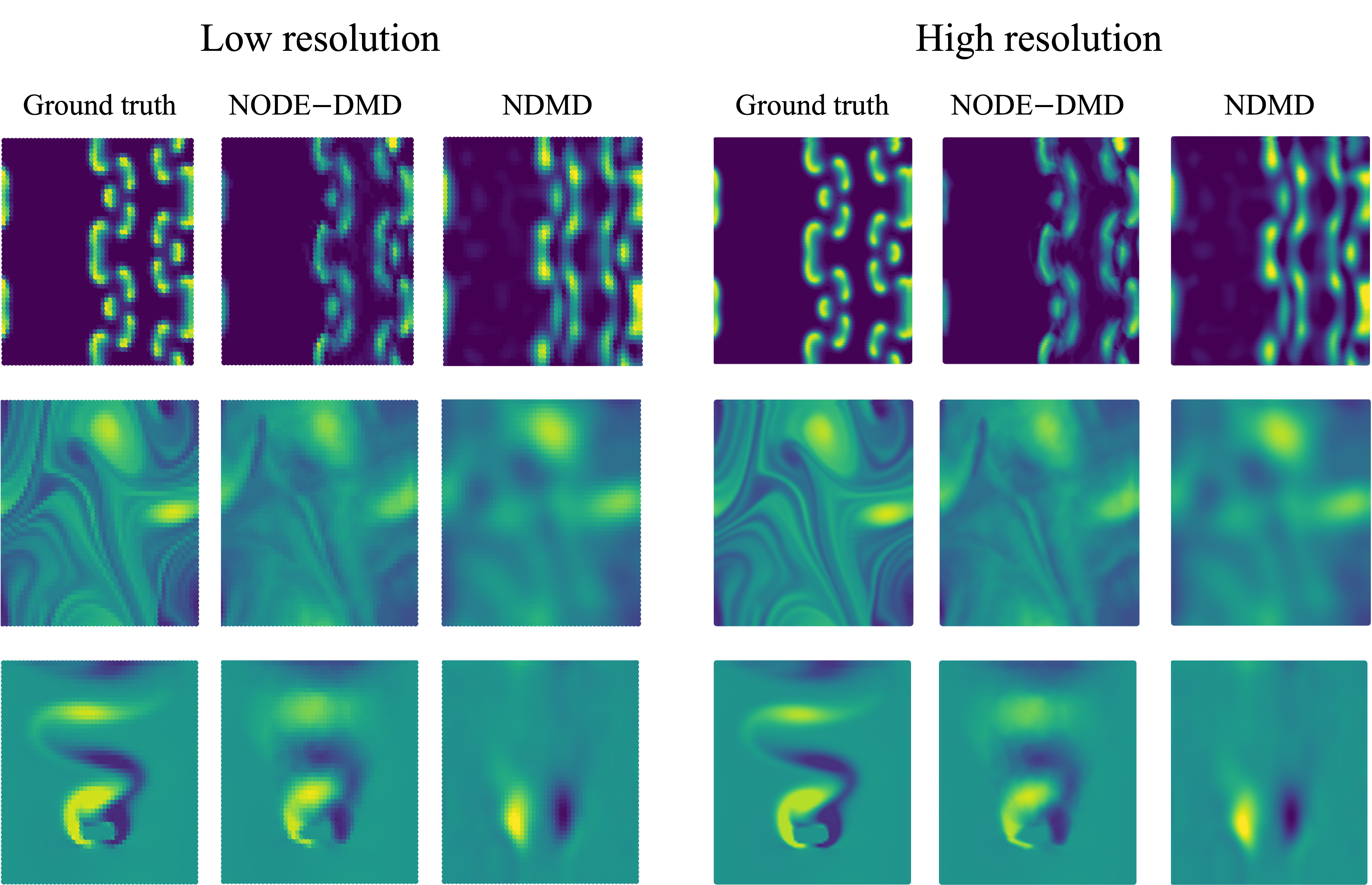 Our experiments demonstrate that Stochastic NODE-DMD is able to reconstruct the spatiotemporal dynamics of the system from sparse observations compared to the baseline method.